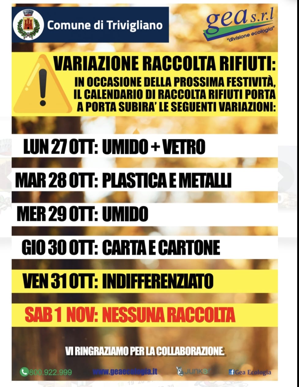 AVVISO RACCOLTA DIFFERENZIATA RIFIUTI FESTIVITA' TRIVIGLIANO